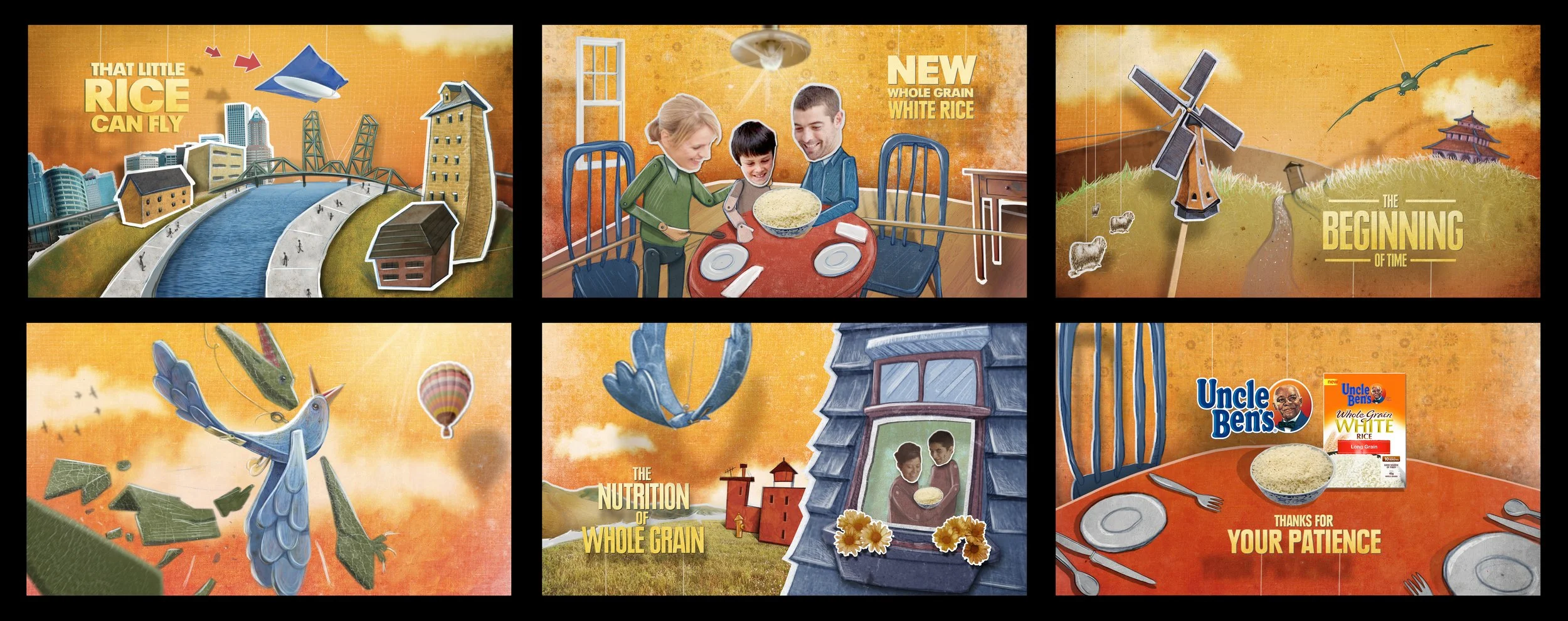 Rice is a food that has sustained families and communities for thousands of years. This concept proposed telling the story of a modern family, in the style of an ancient puppet show. It would take us on a journey from the rice filelds of south asia, to the dinner table of a modern family, pairing an old storytelling style with modern production techniques.